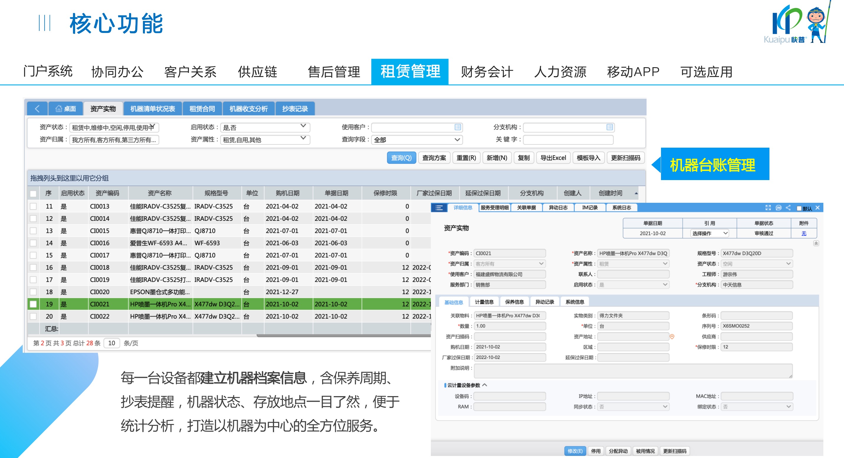 快普易30基于快普近20年在全國上萬家OA企業(yè)的實施與服務(wù)經(jīng)驗,融合了行業(yè)成功的管理智慧,以“客戶+機(jī)器”為中心提供數(shù)字化轉(zhuǎn)型解決方案,全面解決銷售、服務(wù)、租賃等多種業(yè)務(wù)模式的管理需求,以及企業(yè)經(jīng)營核算分析。