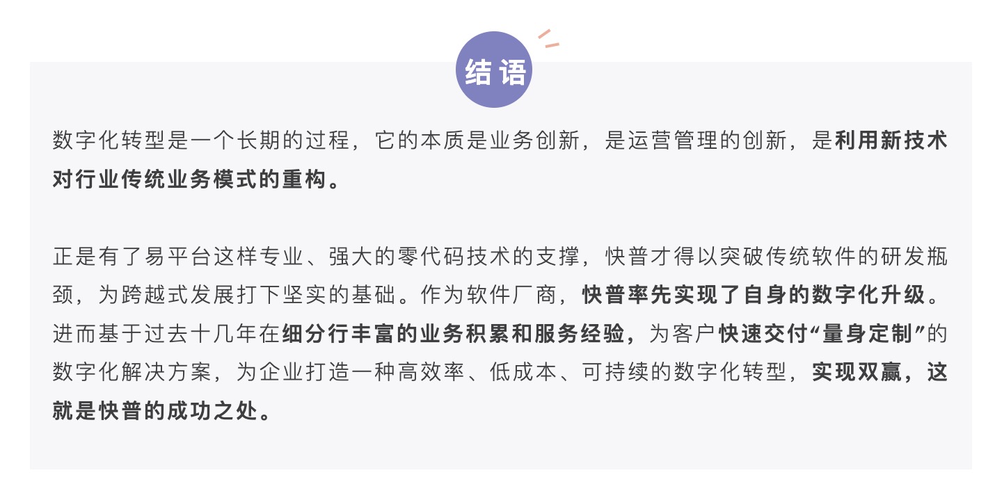 是的,我們可以很自信地說“快普零代碼平臺讓數(shù)字化轉(zhuǎn)型變得簡單、可行”。這個是面對數(shù)字化轉(zhuǎn)型的所有角色而言的,包括我們自身軟件研發(fā)、實施交付,以及合作伙伴、用戶等,易平臺在效率、成本、技術(shù)門檻和可擴展性等方面來說都有著顛覆性的突破,是非常有意義和必要的基礎(chǔ)設(shè)施。總結(jié)說有下面幾點: